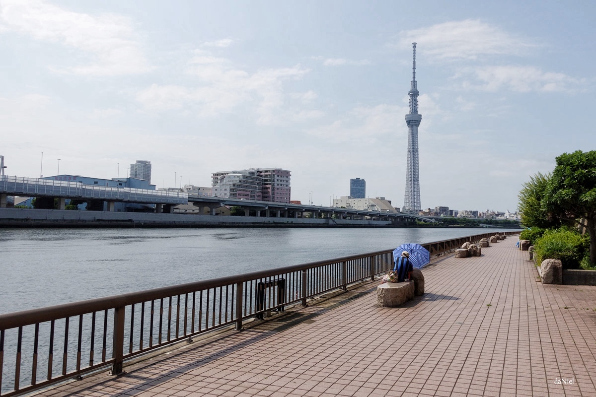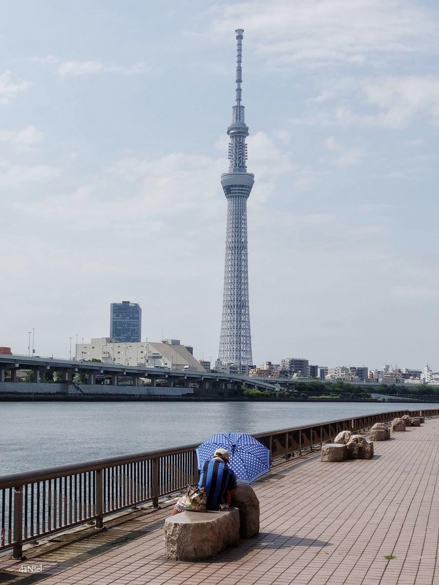 Sa promenade au bord de la rivière Sumida n’a en fin de compte rien de rafraichissant, une simple envie de voir de l’eau, de l’eau à tout prix dans la touffeur de l’été, peut-être sentir aussi un peu de vent, mais non, pas un souffle, il suffoque encore. Sur la large promenade aménagée qui s’étire vers l’infini, il ne rencontre personne, travail oblige, alors il marche encore et ne sait plus pourquoi il est venu jusqu’ici. Pourtant il y a bien quelqu’un au loin, une toute petite forme qui grossit lentement et s’avère être un parapluie … avec un homme assis dessous. Un homme dont il ne voit pas le visage, car il à côté de lui sans se retourner, un peu plus loin dans l’herbe il y a ses affaires personnelles, proprement empilées, une petite tente aussi. Tout de suite il pense à ce livre adoré. Poétique de la ville. Pierre Sansot, sociologue, anthropologue, philosophe et écrivain, d’une plume délicate et généreuse. Lisons Pierre Sansot :