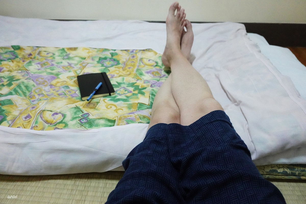 Adossé au mur d’une chambre minuscule, deux heures du matin, des bruits de pneus mouillés sur l’avenue cinq étages plus bas. La saison des pluies commence et il pleuvait à l’aéroport. La chambre mesure trois tatamis, elle est équipée d’un frigo de poche Haier, d’une télé écran plat Mitsubishi, d’un futon, d’une table basse et d’un zabuton, rien de plus. Il se sent comme en cellule.