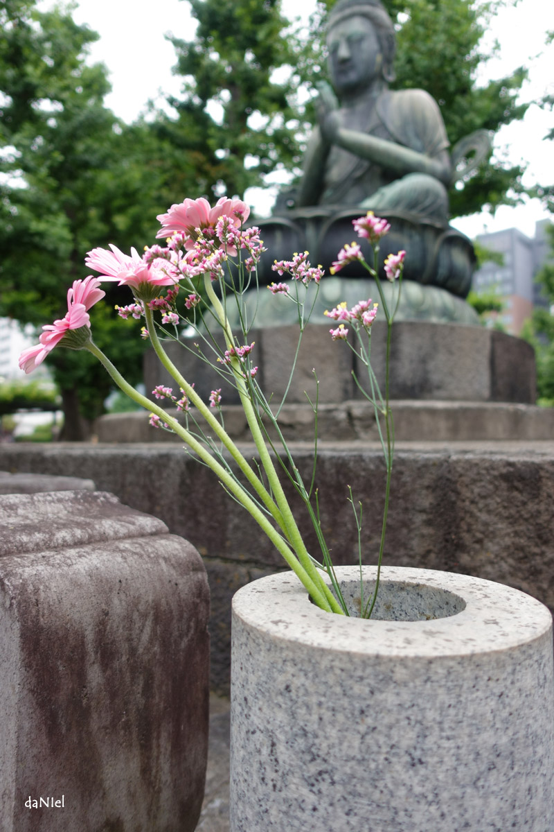 Asakusa, un gong fait trembler l’air tiède du matin. Il s’est assis sur un banc, garde les yeux fermés en attente du prochain tremblement. Un peu partout, dans les petites rues autour du temple, des hommes et des femmes se tiennent debout, droits, parfaitement immobiles. La vibration du gong les retient et les électrise. Au dernier coup, ils joignent leur mains pour un salut et à nouveau se remettent en marche, certains se sourient, le moine qui a réveiller le gong descend de son perchoir, ferme derrière lui la petite porte de la clôture qui entoure l’énorme gong et rejoint les passants. Il est salué, remercié.