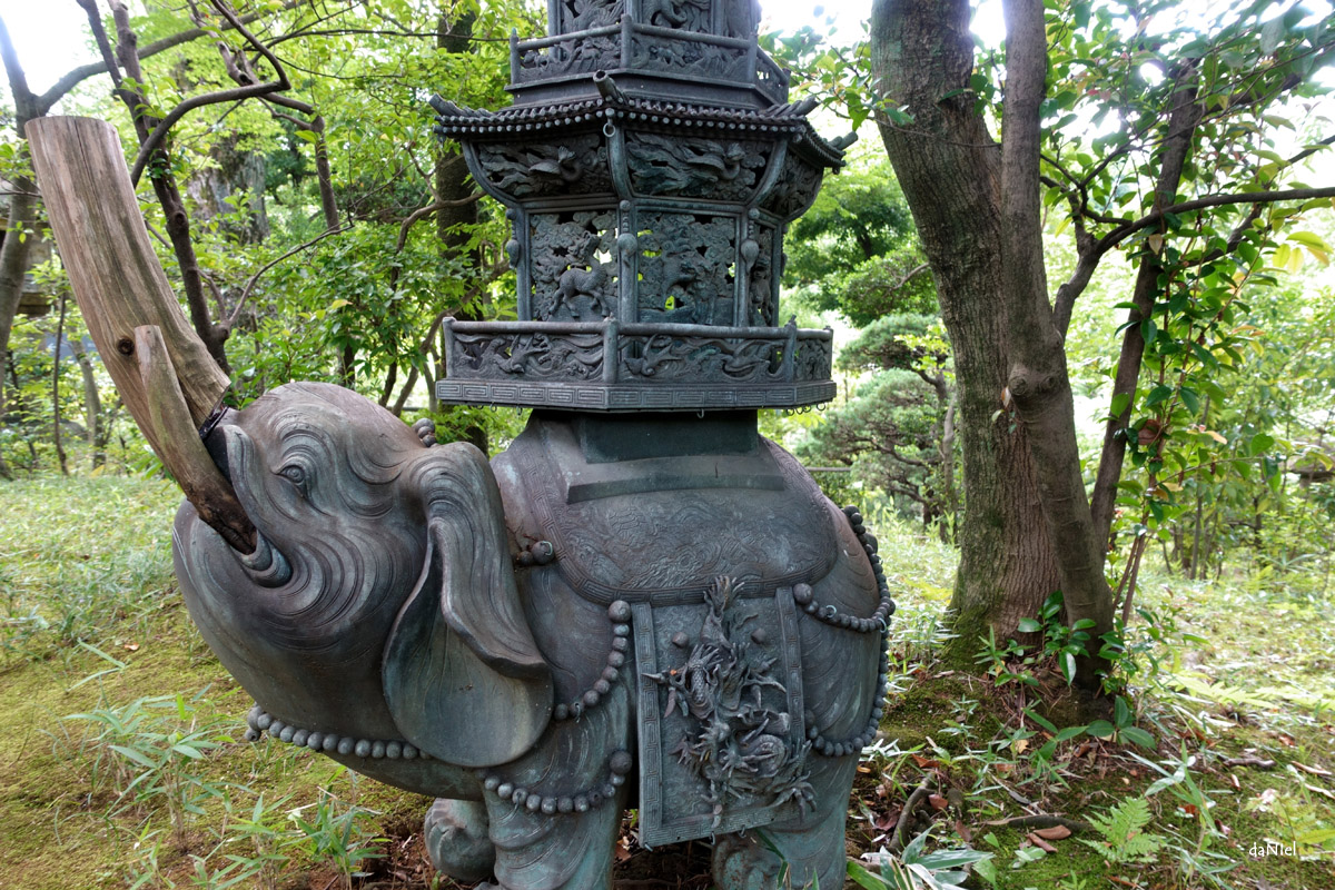 Le chemin grimpe sur une colline, descend dans une combe ensoleillée, un plan d’eau, une barque moussue, le monde entoure le monde qui entoure le monde. Parmi les innombrables jardins de la ville il est le préféré. Sans doute parce qu’on y pénètre comme on s’avance dans un monde souterrain peuplé de créatures rêvées. Aux détours des sentiers, deux hommes chats sentinelles, un éléphant, des lions de pierre. Surtout ne pas les offenser.